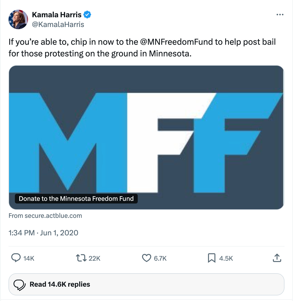 6/1/20: Harris encourages people to donate to protest bail fund. This tweet about encouraging people to donate to the MN Freedom fund was later used by Trump to attack Harris.