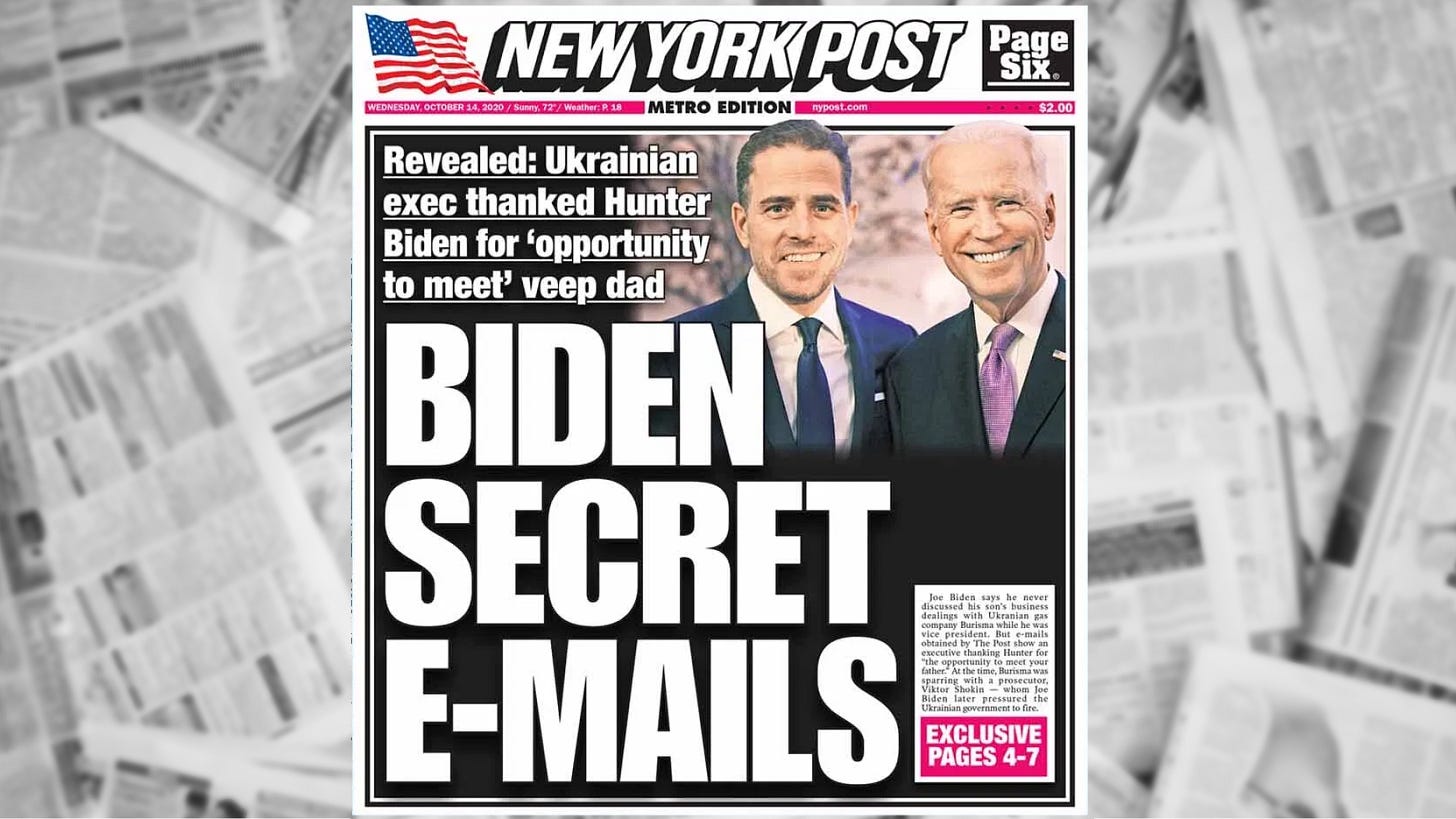 10/14/20: Hunter Biden laptop controversy. On this day, the NY Post published a story about a laptop that Hunter Biden had abandoned at a computer repair shop. This story was censored by many social media platform and days many intelligence agents claimed it was likely misinformation. It was later determined that the laptop likely belonged to Hunter Biden.