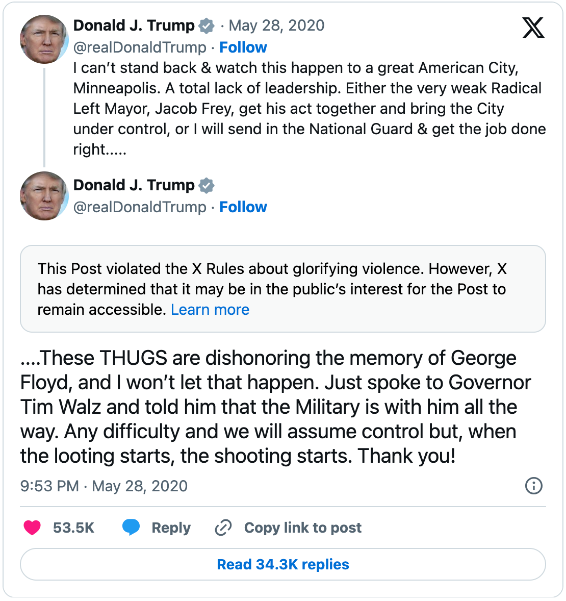 5/28/20: “When the looting starts, the shooting starts.” Trump says the violence is disrespecting the memory of Floyd, and uses the controversial phrase “When the looting starts, the shooting starts.”