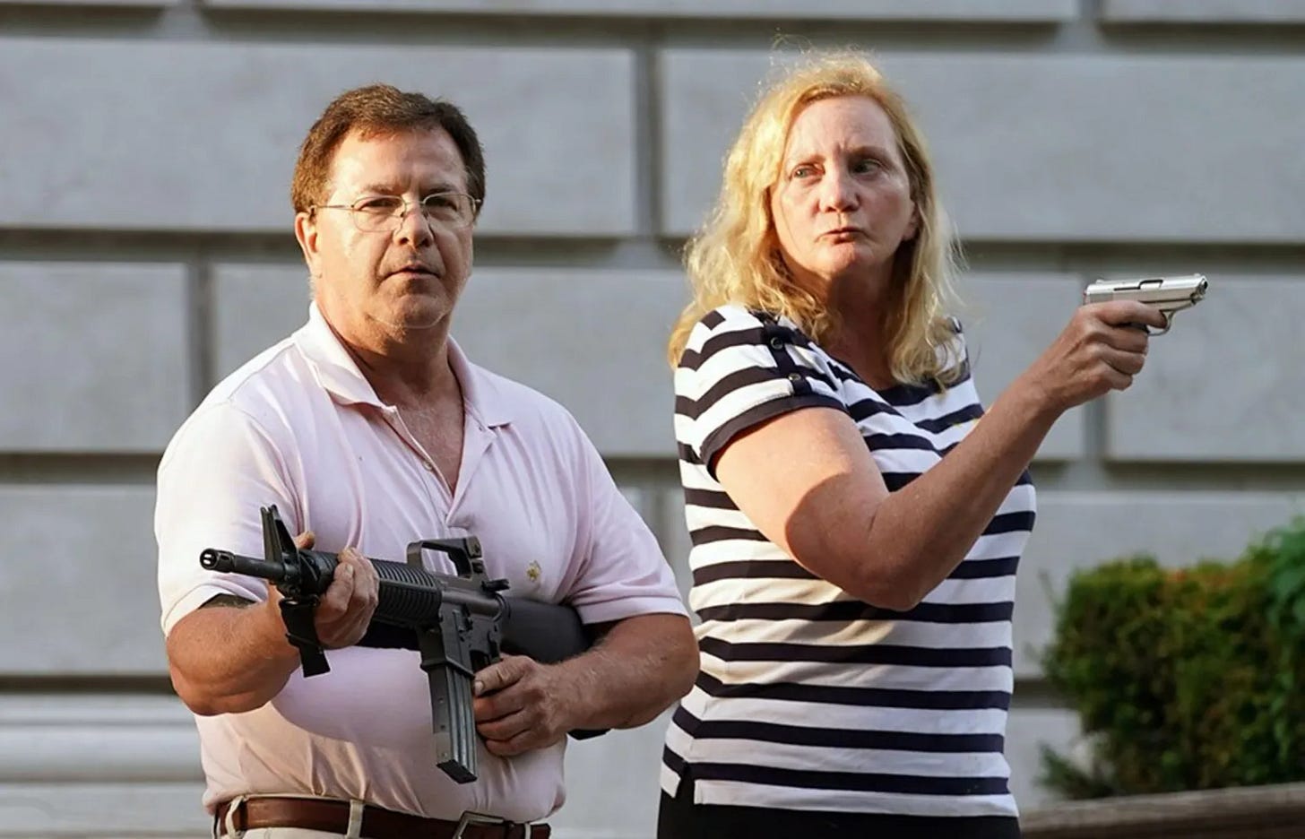 6/28/20: Mark and Patricia McCloskey point guns at BLM protestors. As BLM protestors walked through their private neighborhood, these two Saint Louis attorneys were filmed pointing guns at them. They became folk heroes of the right and spoke at the RNC. They were prosecuted by the county of Saint Louis but eventually pardoned.
