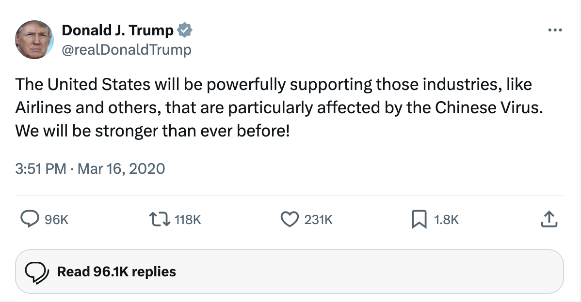 3/16/20: Trump refers to COVID as “the Chinese virus.” The name of the virus would become a culture war issue with the left saying the Trump calling it the Chinese virus was to blame for anti-Asian hate crimes.