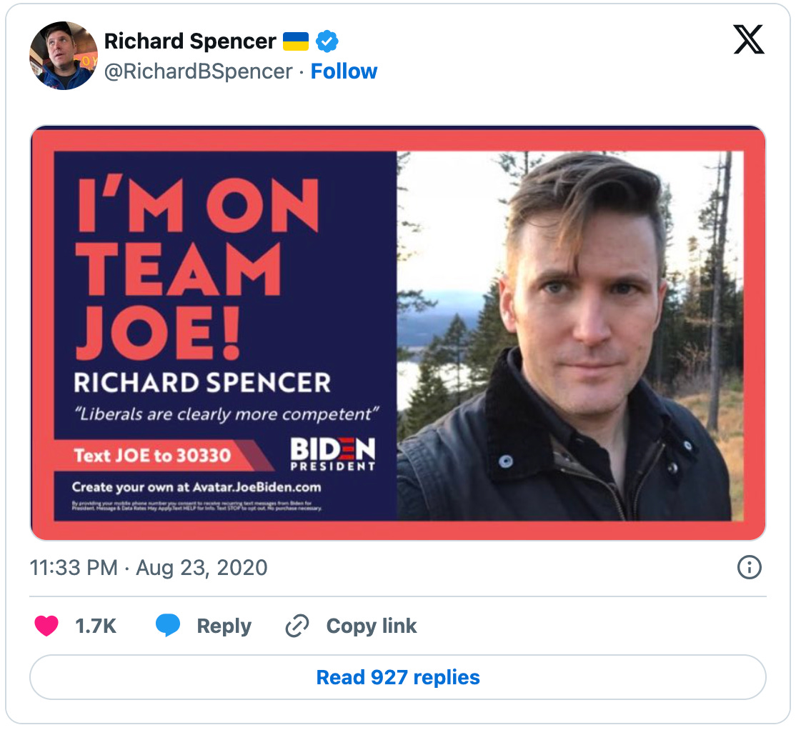 8/23/20: Richard Spencer endorses Biden. Breaking with his alt-right past, Spencer says that he supports Biden because liberals are clearly more competent.