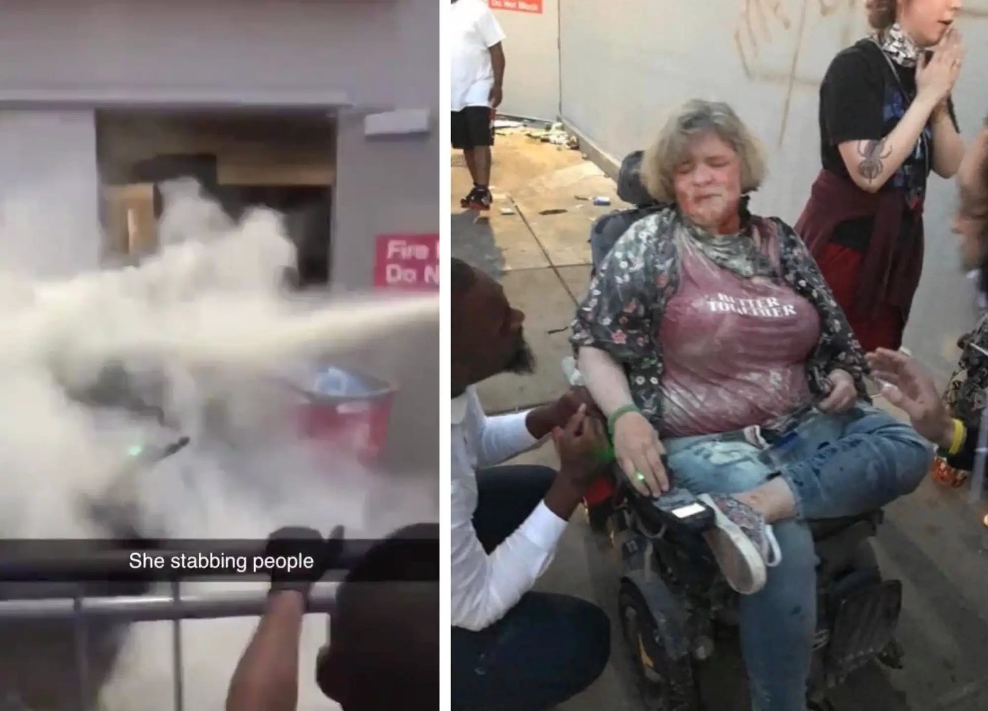 5/28/20: Target Wheelchair lady. A white woman in a wheelchair worked to defend a Minneapolis target from being looted by blocking the path of looters, before she was sprayed with a fire extinguisher. There are claims that she had a knife but it is hard to tell exactly. She becomes a meme. The pro BLM people thought she was a busy body, while the anti-BLM people used her as an example of a vulnerable person being attacked. Years later, it is difficult to tell exactly what happened. The moment was later parodied in the TV show Atlanta. Target later reopened the looted store “with black shoppers in mind.”