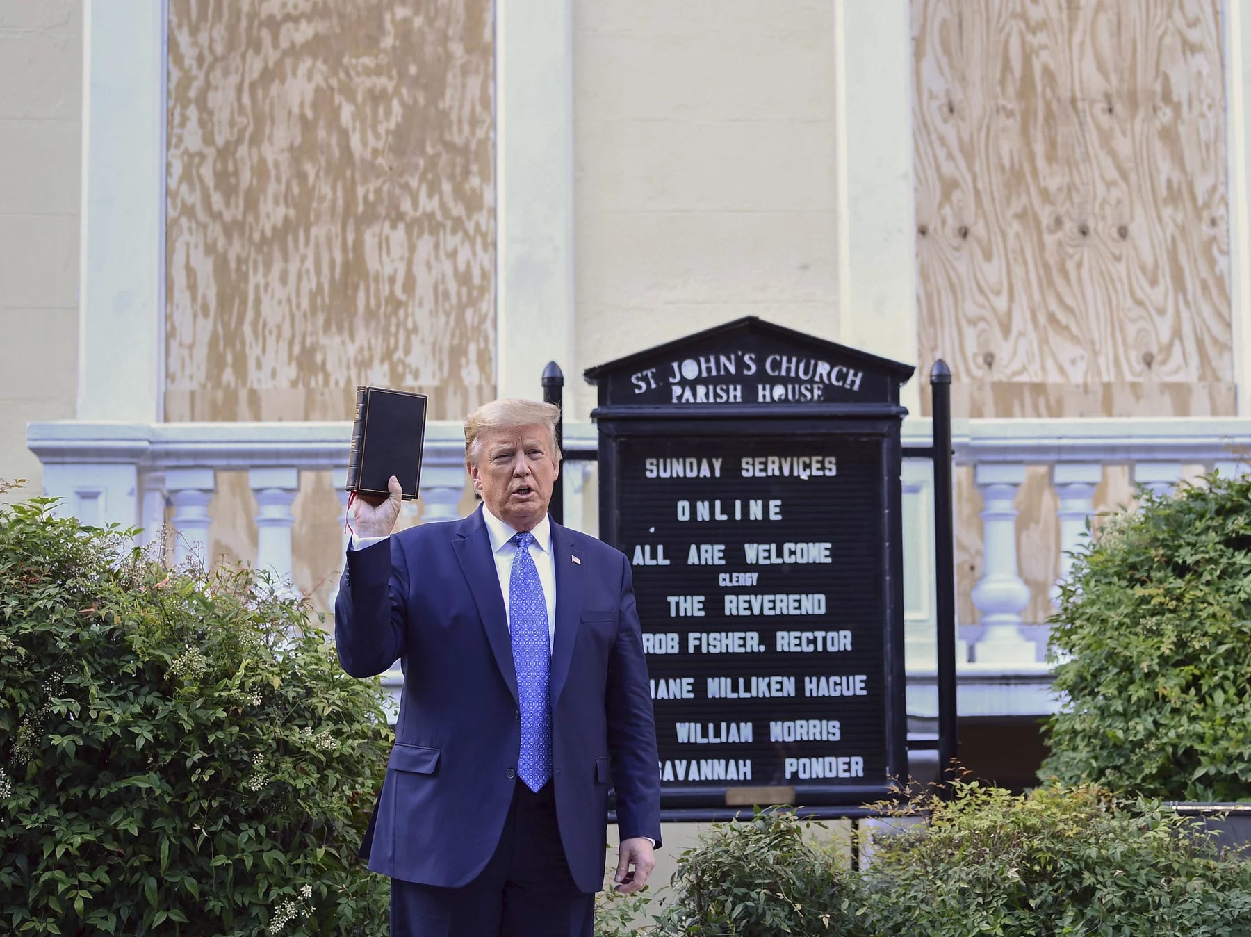 6/1/20: Trump holds Bible outside of St. Johns church. He was accused of teargassing peaceful protestors to get this photo opportunity.