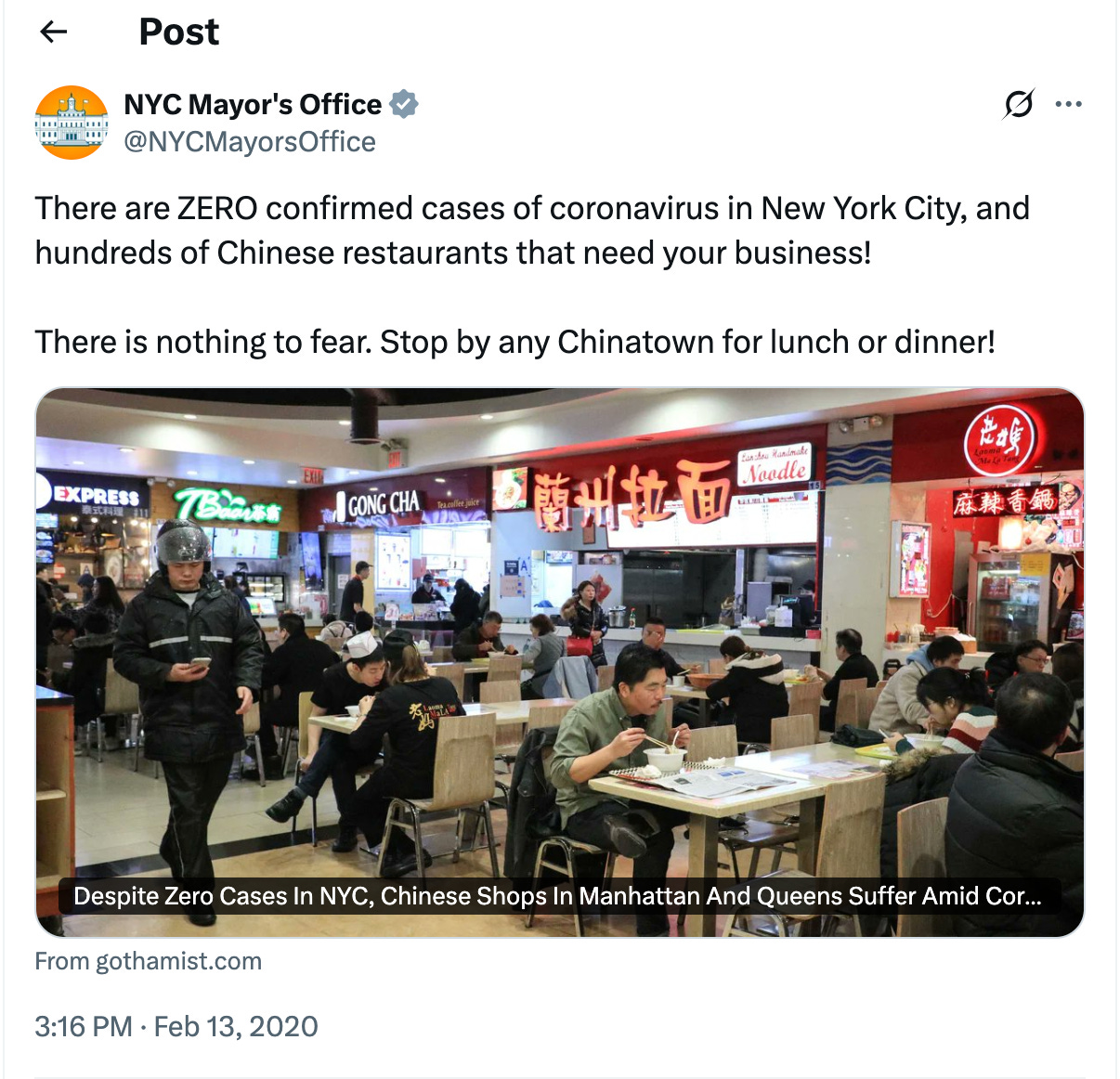 2/13/20: NYC mayor’s Office tells people to come to Chinatown. In the early days of COVID, many politicians were working to reduce xenophobia and telling people to go to Chinatowns and Chinese New Years parades. These posts would be thrown back in their faces when COVID cases spiked.