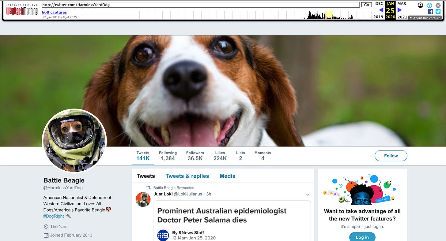 1/25/20: Battle Beagle first appears in a hazmat suit. This day marks the oldest entry in the Wayback Machine where popular right-wing account Battle Beagle appears in a hazmat suit. During this period many rightwing anons were worried about the impacts of the Coronavirus, and put themselves in hazmat suits, while many in the mainstream were downplaying it.